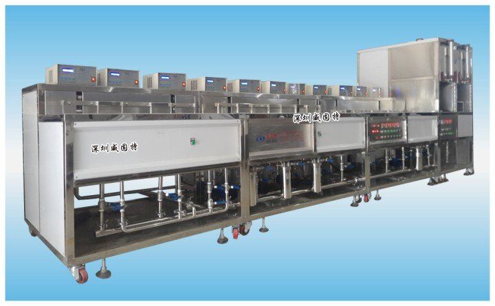 自動上料→洗劑超聲清洗→洗劑超聲清洗→純水噴淋洗→純水超聲清洗→純水超聲清洗→純水超聲波清洗→純水超聲波清洗→純水超聲波清洗→自動下料。