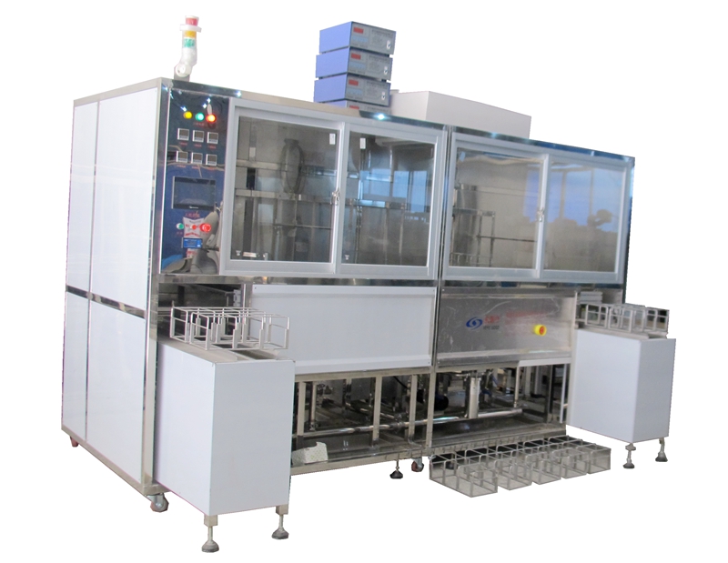 人工進料→洗劑超聲波粗洗→洗劑超聲波精洗→純水鼓泡漂洗→超聲波漂洗→離心干燥→人工出料。